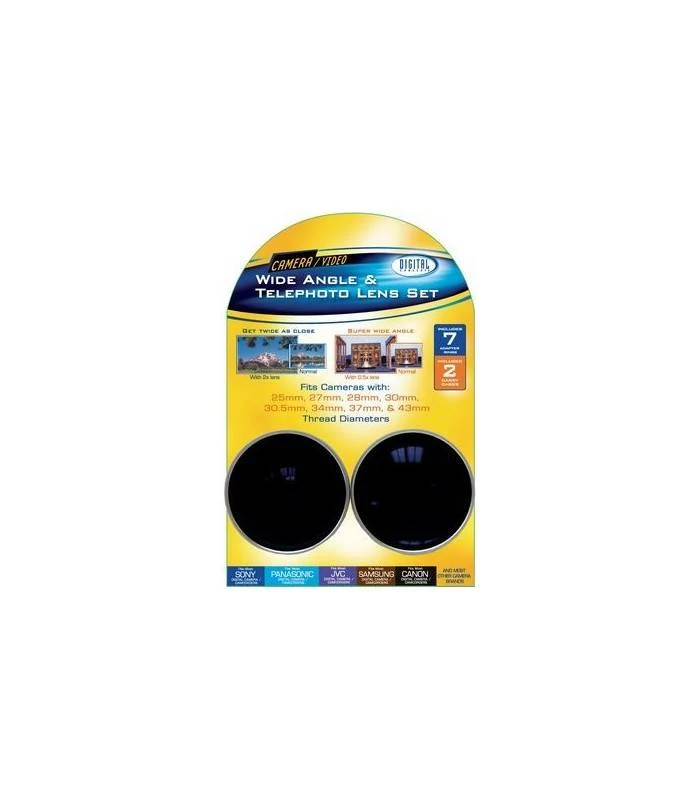 This Wide Angle and Telephoto Lens Set fits cameras with 25mm, 27mm, 30mm, 30.5mm 34mm and 43mm. It includes 7 adapter rings and 2 carrying cases. Great for digital cameras and camcorders.