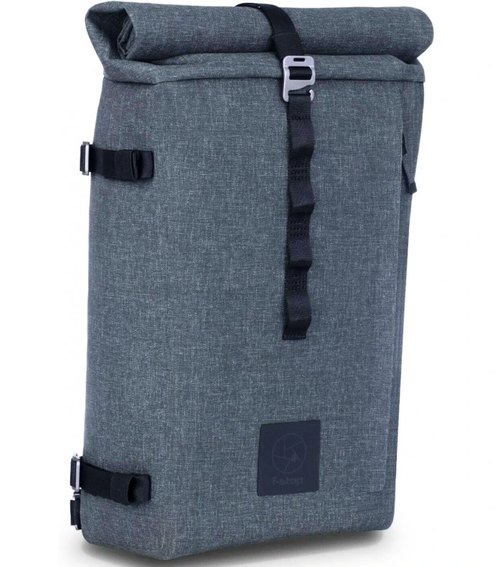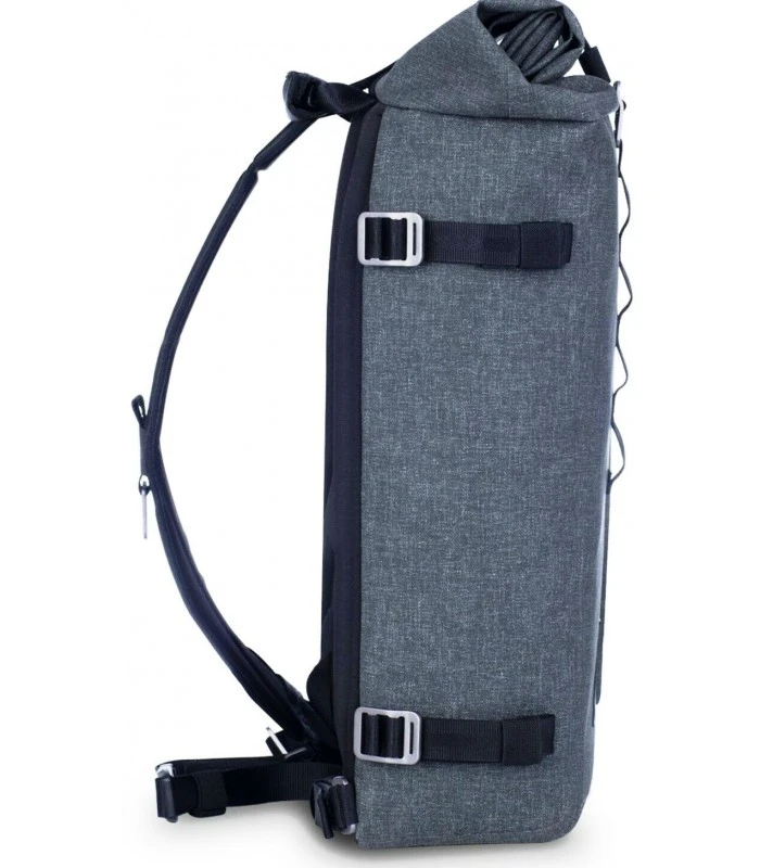 Cuando está firmemente enrollado, la parte superior se puede asegurar con una correa de compresión incorporada que utiliza un gancho en G fuerte pero fácil de liberar