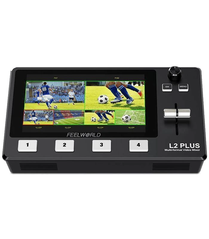 - Feelworld Livepro L2 PLUS Mezclador de vídeo profesional multiformato con cuatro entradas HDMI para transmisiones en directo.