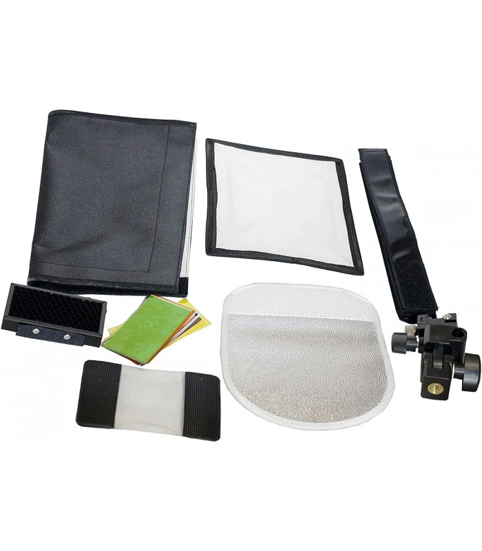 - -Compuesto por un softbox, filtros de color, nido de abeja, mini reflector, snoot, soporte flash y paraguas; este kit es perfecto para conseguir diferentes tipos de iluminación.