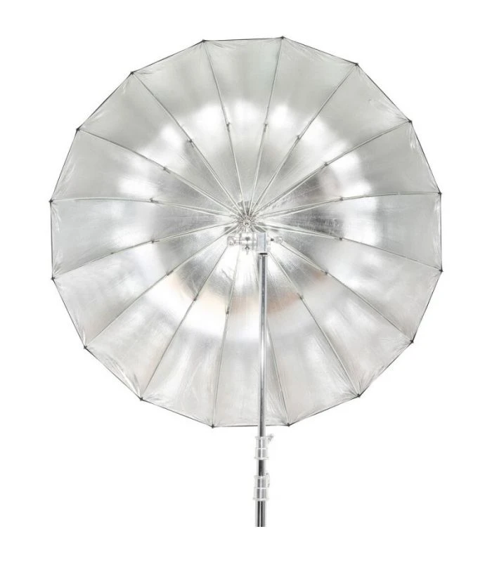 - El paraguas parabólico plateado refleja y difunde uniformemente la luz de cualquier fuente: luces estroboscópicas de flash, bombillas o lámparas fluorescentes fotográficas. Es el elemento básico de los equipos de estudio en el campo de la modificación de la iluminación.