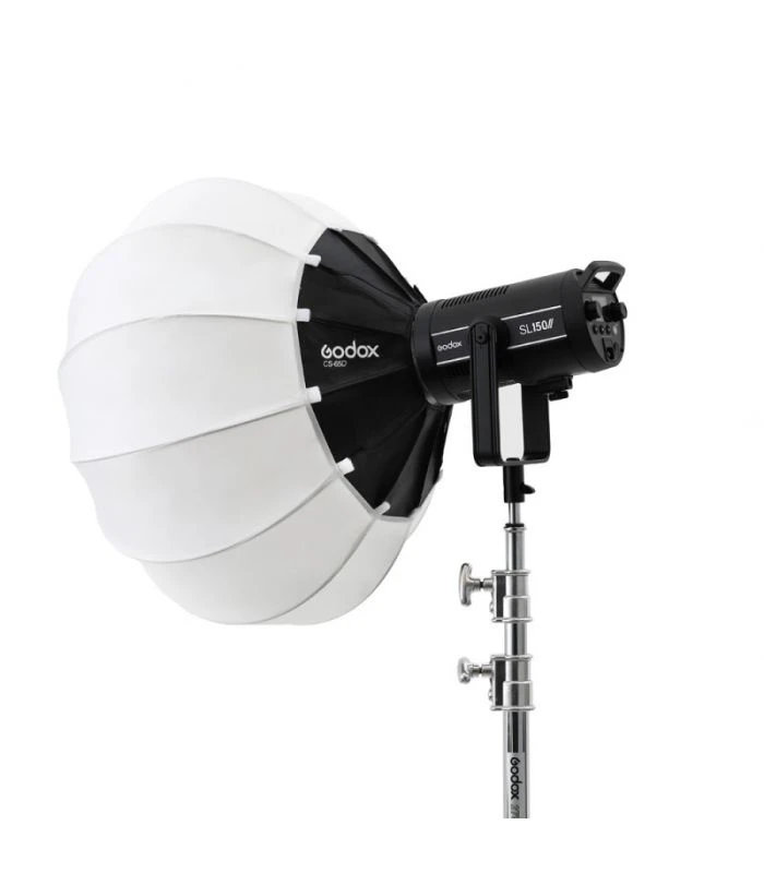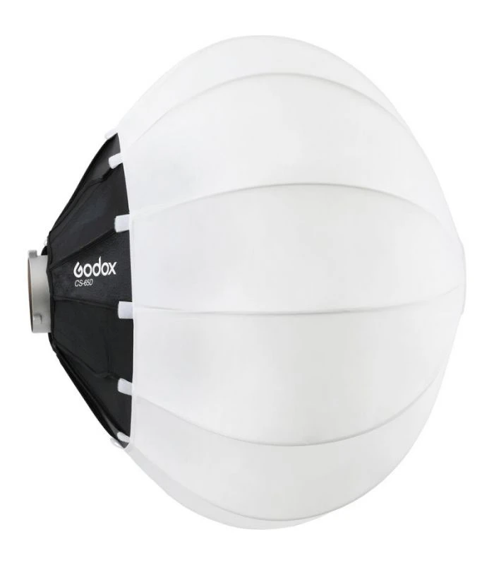 - Softbox esférico Godx CS-65D con diseño de paraguas con montura Bowens. El diámetro de 26 pulgadas (65 cm) garantiza la movilidad y la comodidad del trabajo. El juego incluye un esqueleto, material exterior y un estuche duradero.