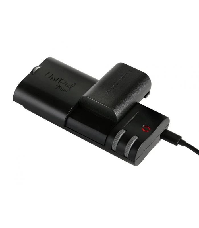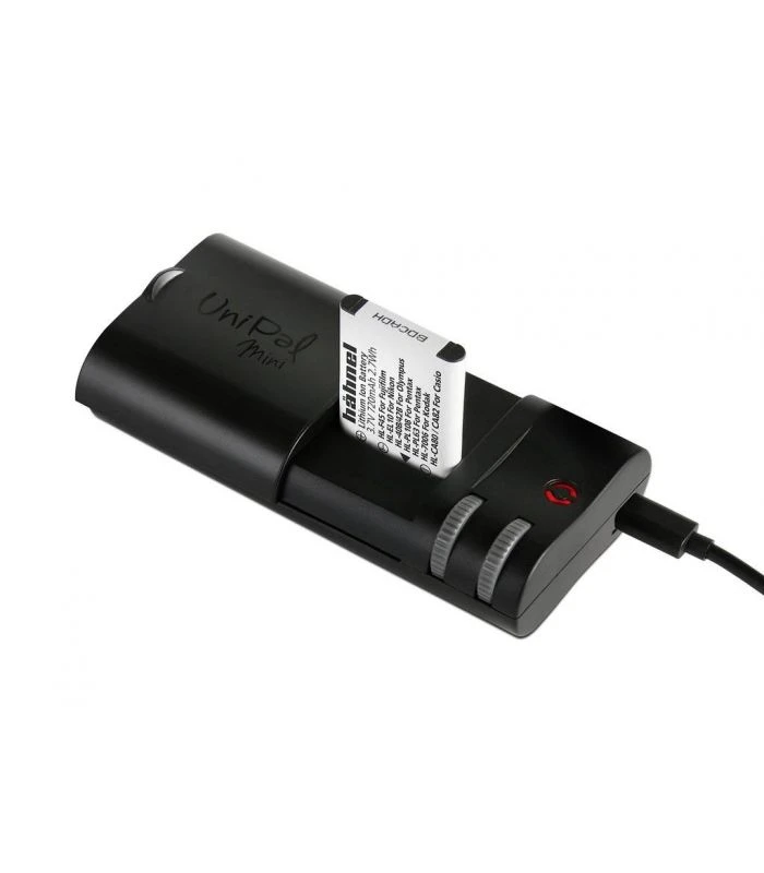 - Cargador universal muy compacto con ruedas de ajuste fino de los contactos, para poder colocarlos con mucha precisión para la batería correspondiente.