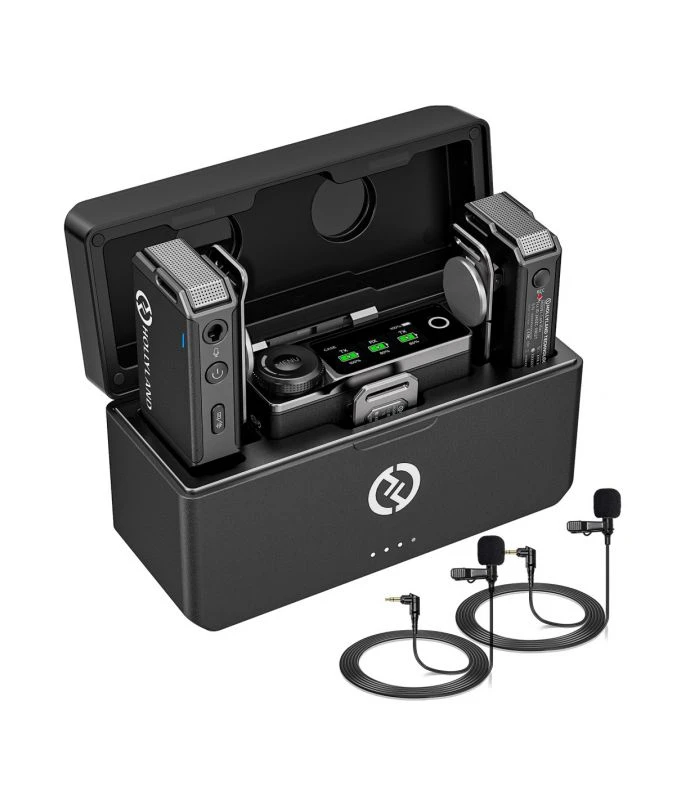 - Características clave: 2 emisores + 1 receptor + 2 micrófonos lavalier + caja de carga