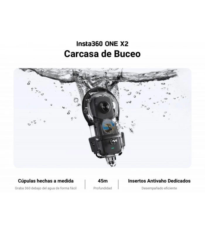 - Carcasa para buceo One X2 ha sido diseñado para poder grabar bajo el agua hasta 45 metros con una calidad espectacular gracias a que las cúpulas han sido diseñadas específicamente para la OneX2