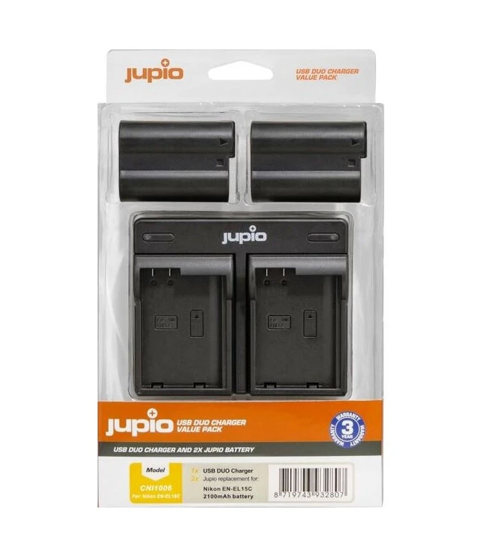 - El paquete económico de cargador dual USB de Jupio que consta de 1 cargador de batería dual USB y 2 baterías EN-EL15C para Nikon.