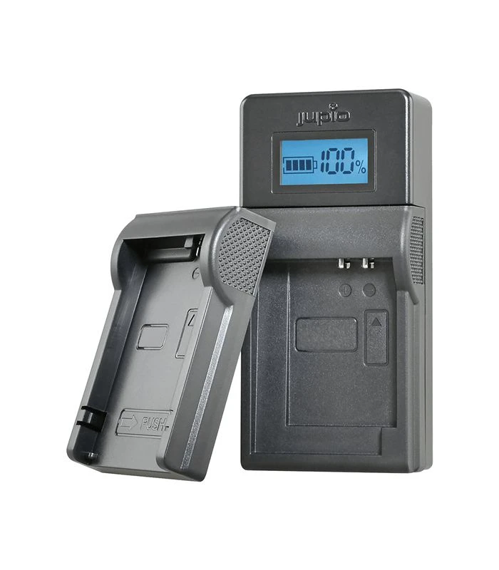 - El kit de cargador USB de la marca Jupio es adecuado para baterías de 7,2 V-8,4 V de Panasonic y Pentax. El estado de carga de la batería es fácil de leer en la pantalla LCD. El cargador se carga a través de la conexión micro-USB o USB-C. Con este cargador se incluye un cable Micro-USB. La corriente de salida del cargador es de 700 mA.
