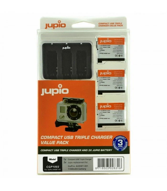 - El kit Jupio con 3x batería GoPro AHDBT-401 Hero4 1160mAh + Cargador USB triple compacto es un conjunto completo que contiene tres baterías para la GoPro Hero4, un cargador USB y cargador de coche. El cargador de batería es adecuado tanto para cargar las baterías suministradas como para cargar la batería original de su cámara de acción.