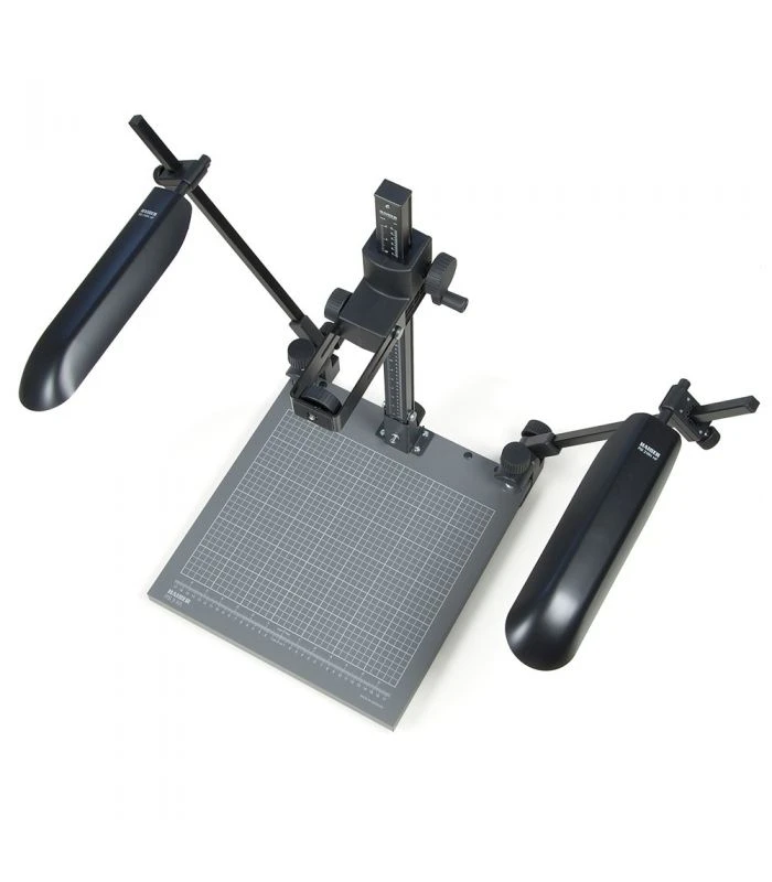 - Sistema portátil compuesto por mesa de reproducción y sistema de iluminación. Base no reflectante en gris con cuadricula y escala en cm/pulgadas