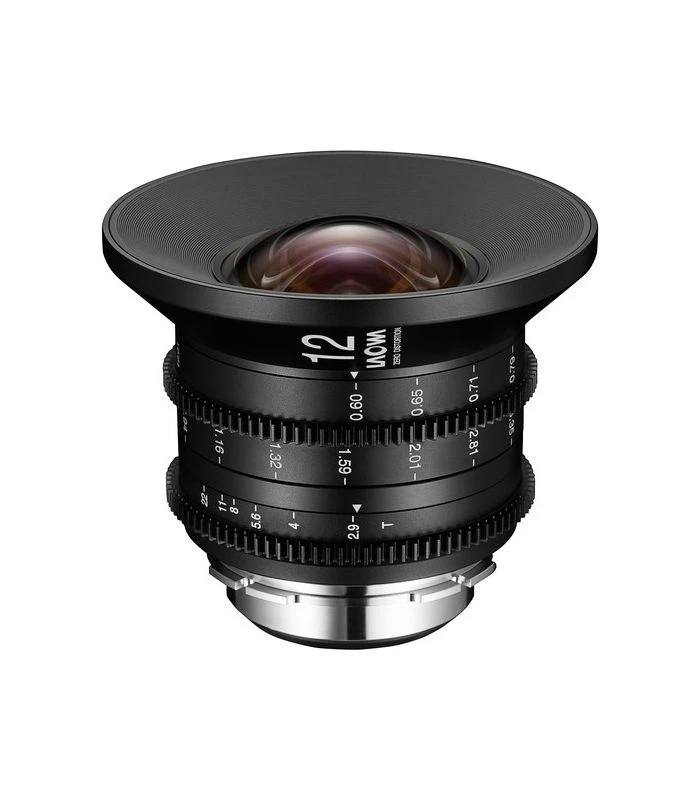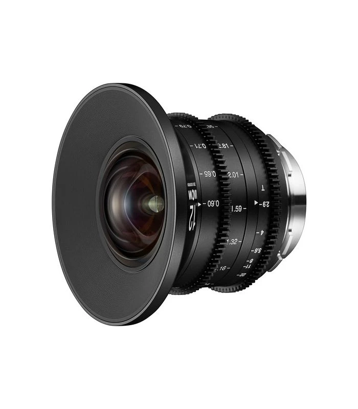 El objetivo de cine de 12 mm cuenta con una apertura máxima de T2.9 con 16 elementos en 10 grupos. Su apertura de 7 hojas proporciona un bokeh suave y agradable, una profundidad de campo reducida con poca o ninguna distorsión y una distancia de enfoque cercana de 7″. Los anillos de enfoque y apertura cuentan con engranajes de paso de 0,8 estándar de la industria que se adaptan a los motores de enfoque de seguimiento de cine estándar. El diámetro frontal de 102 mm se puede aumentar hasta 114 mm con el adaptador incluido para adaptarse a las cajas mate estándar de la industria para evitar el deslumbramiento y los reflejos, así como para agregar filtros. Las marcas de enfoque, apertura y profundidad de campo se encuentran en los pies en el costado de la lente para ayudar a los foquistas.