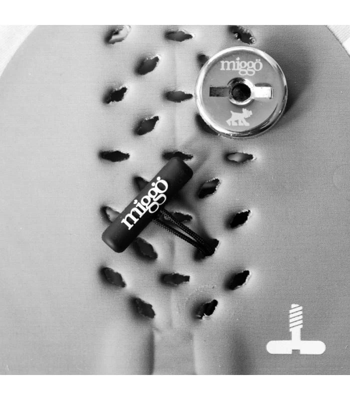 Tornillo recubierto de níquel multiuso especialmente diseñada de miggo de acero sirve como un conector de seguridad en la rosca para el trípode 1/4 «-20 ubicado en el cuerpo de la cámara. También permite al usuario conectar un trípode mientras miggo se adjunta. Un bolsillo interior flexible designada está diseñado para llevar una tapa de la lente cuando no está unida al objetivo. Un cordón de seguridad mantendrá su cámara fija a la correa.