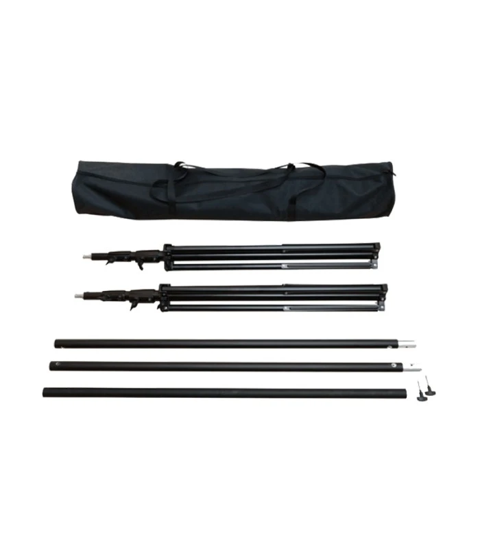 - Soporte para fondos de estudio básico Nanguang TIY34041 de 3 metros de ancho y 2,86 metros de altura compuesto por dos trípodes y barra horizontal desmontable en tres secciones. Incluye también funda de transporte