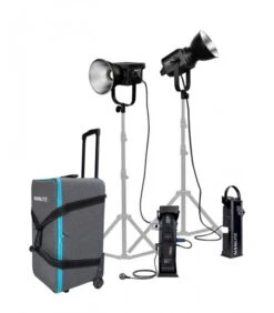 - Incluye: 2 × Foco Forza 300, 2 × Adaptador de corriente AC, 2 × cable de conexión, 2 × Pinza para pie de estudio, 2 × Reflector estándar, 1 × Bolso Trolley.
