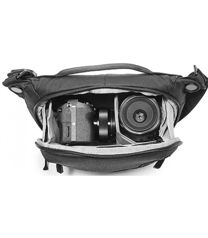 El Everyday Sling v2 negro de 3L de Peak Design es una opción de transporte compacta y versátil que se puede usar alrededor de la cintura o como una bolsa de honda. Cuando se usa como una eslinga, la correa antideslizante acolchada se puede configurar para usar sobre el hombro derecho o izquierdo. Diseñada para ajustarse cómodamente contra el cuerpo, la apertura de la cubierta con cremallera 3L Everyday Sling v2 permite acceder fácilmente al compartimento principal, que incluye un divisor que se puede configurar de acuerdo con el equipo específico que se lleva. El divisor es plegable y puede acunar superficies curvas, como el agarre de una cámara con una lente incorporada. Durante el uso, el divisor plegable mejora la protección entre esas superficies curvas y elementos adyacentes mientras minimiza el área entre ellas para un uso más eficiente del espacio del compartimento principal.