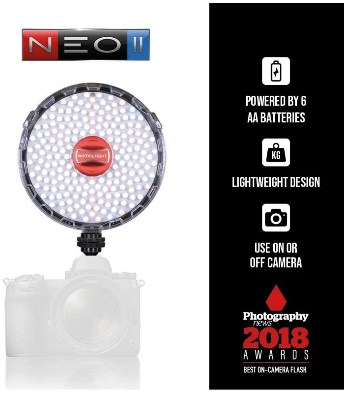 Capaz de funcionar como luz continua o como flash, la luz LED redonda NEO 2 de Rotolightabre nuevos caminos con funciones diseñadas para satisfacer las demandas de los grabadores de video y fotógrafos. La característica más importante de este dispositivo es la inclusión de un receptor Elinchrom Skyport de 2,4 GHz integrado, que permite la sincronización de alta velocidad y la activación remota de la unidad desde una distancia de hasta 656 ‘cuando se utiliza un transmisor Skyport opcional. Además, cuenta con la tecnología Accu-Color para garantizar una reproducción cromática óptima, comprobada por el CRI clasificado de 96 y el TLCI de 91. La salida también se ha mejorado significativamente, con un aumento del 85% con respecto a su predecesor, y un modo de flash que puede aumentará la producción en un 500% para imágenes fijas y ayudará a congelar la acción. A potencia máxima, esto da como resultado una salida de 2000 lux a 3 ‘para iluminación continua y un ajuste de f / 8 a ISO 200 para flash.