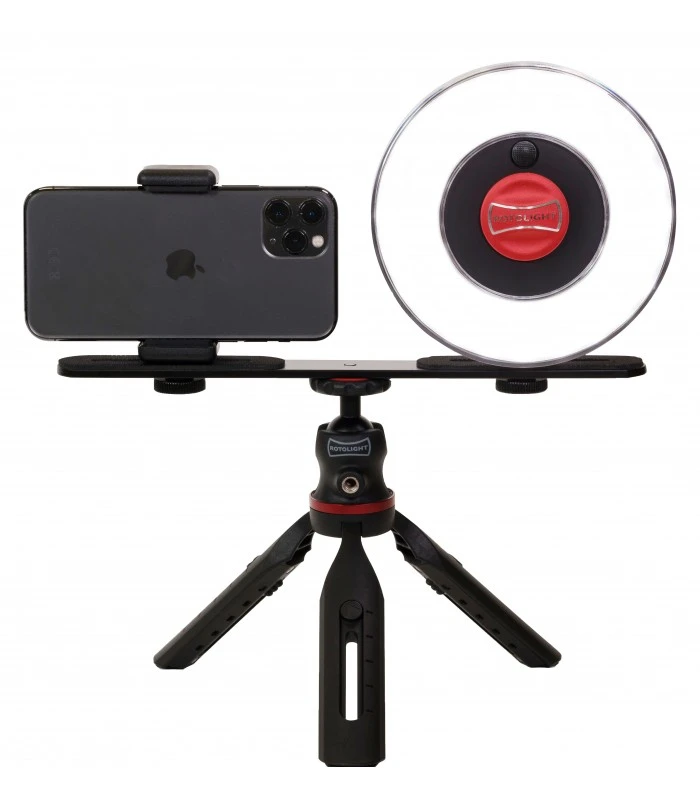 El kit Rotolight Ultimate VLogging es muy adecuado para el Vlogger, YouTuber, creador de contenido o maquillador que lleva un teléfono inteligente, ya que la luz compacta se monta junto a su teléfono inteligente gracias a los componentes del kit incluidos. La barra de montaje de accesorios y el clip para teléfono inteligente le permiten montar su teléfono inteligente en un extremo de la barra de accesorios, mientras que el adaptador de soporte le permite montar el RL48 en el otro lado, creando una cámara compacta y una configuración de iluminación. Esto proporciona una luz suave y hermosa para su rostro mientras habla con su audiencia a través de su teléfono inteligente.