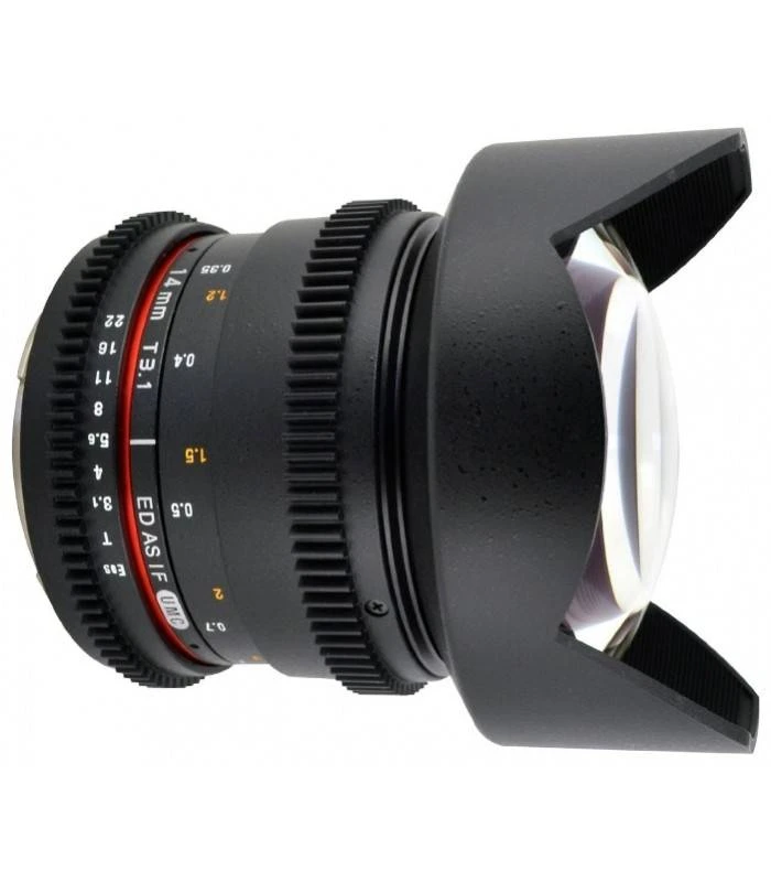 El objetivo Samyang V-DSLR es un objetivo cine especialmente diseñado para grabar con las cámaras DSLR Nikon con sensor APS-C y Full-Frame. El Objetivo Samyang 14mm T3.1 V-DSLR IF ED AS UMC Nikon es un gran angular focal fija y enfoque manual esencial para los profesionales y amantes de los vídeos y fotografías de paisajes, arquitectónica, vistas panorámicas, de interiores o espacios muy reducidos en los que resulta muy difícil incluir todos los elementos en la composición.