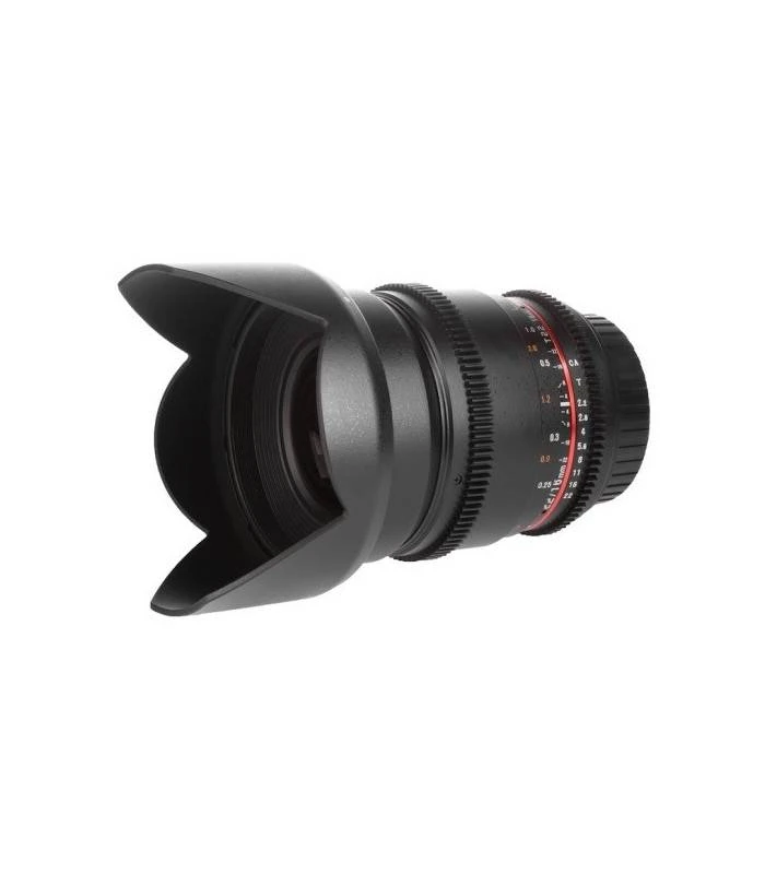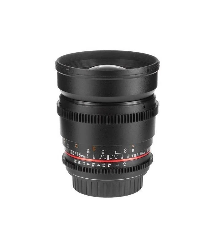 Objetivo Súper Gran Angular Samyang VDSLR 16mm T2.2 Nikon, especialmente diseñado para grabar con su cámara réflex Nikon con sensor APS-C.