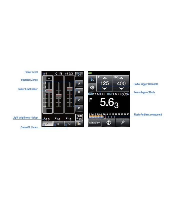 La gran pantalla LCD (2,7 «) muestra luz ambiental, flash, cine y una gran cantidad de información de una manera clara y comprensible. Los ajustes se realizan con sólo tocar o deslizar el dedo sobre la pantalla.