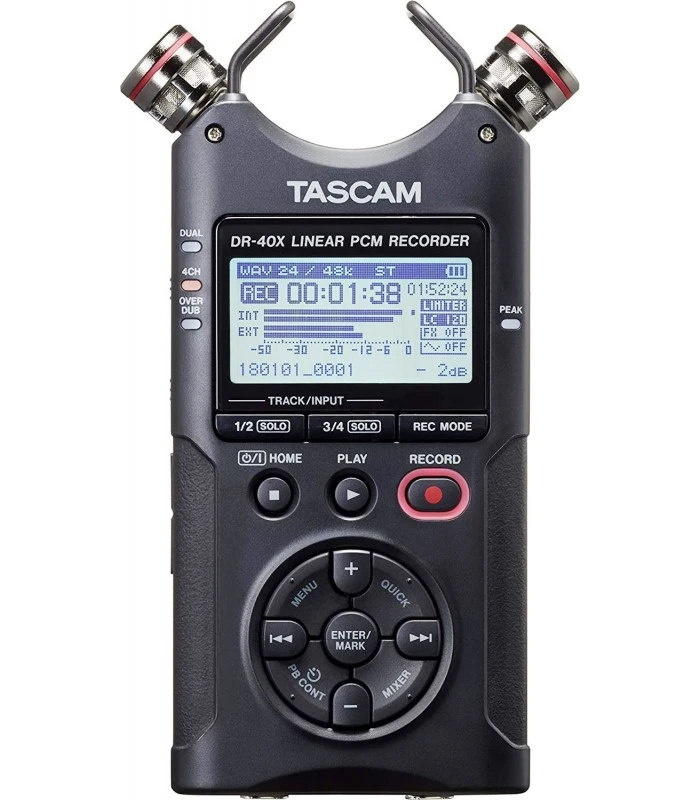 Para podcasts, efectos de sonido y aplicaciones de grabación de música, la grabadora portátil portátil Tascam DR-40X es capaz de capturar hasta cuatro pistas de audio de alta resolución sin necesidad de micrófonos externos. Sus micrófonos condensadores unidireccionales integrados pueden configurarse para una imagen estéreo amplia o ajustada, y pueden usarse simultáneamente con las entradas combinadas de micrófono / línea. Igualmente hábil como dispositivo portátil o cuando se usa en configuraciones montadas en soporte o cámara, el DR-40X puede manejar cualquier cosa, desde sesiones de muestreo y entrevistas hasta podcasts y conciertos en vivo.