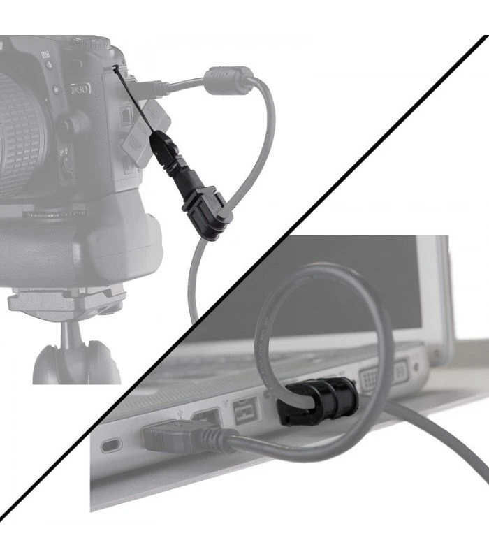 - Utilice el JerkStopper con cualquier cable adaptador A/C, cable sincronizador de flash, HDMI, USB o FireWire. Soporta diámetros de cable desde 3.5mm hasta 8.5mm.