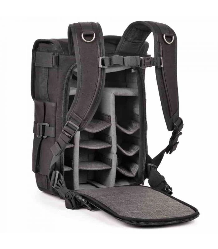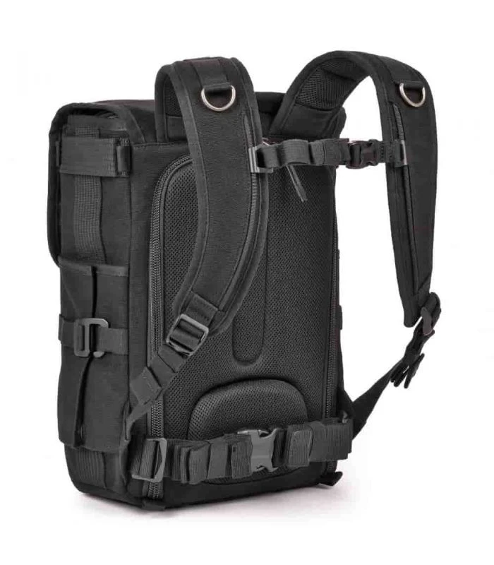 La mochila está diseñada en estilo clásico con un robusto tejido ceñido. Ha sido tratada con DWR para repeler los elementos. Cierra tu mochila con una solapa de seguridad con cremallera por debajo para evitar un acceso rápido en la parte superior. En la parte posterior de la mochila, tienes acceso completo a tu equipamiento, incluyendo el ordenador portátil de 15″. Dentro de la mochila hay un espacio total para 20 litros de almacenamiento, se divide en 5 litros para artículos personales en el compartimento frontal y 15 litros de espacio para el equipamiento. ¿Te gusta disparar con un trípode porque trabajas con velocidades de obturación bajas? Entonces estás de suerte, esta mochila tiene opciones tanto frontales como laterales para conectar un trípode.