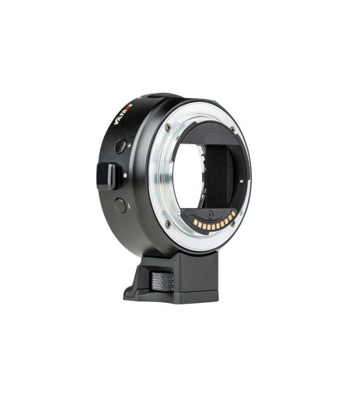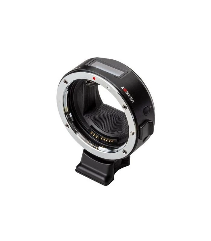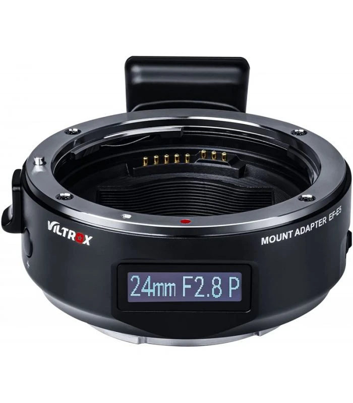 El adaptador de lente Mark V EF-E5 Canon EF a Sony E-Mount Body con pantalla OLED de Viltrox está diseñado para permitir el uso de una lente Canon EF con enfoque automático en una cámara Sony E-mount. La pantalla OLED programable puede mostrar la distancia focal, la apertura, el modo de apertura y el modo de depuración. La depuración permite el ajuste manual para lentes incompatibles, los botones más y menos permiten ajustar los parámetros de enfoque.